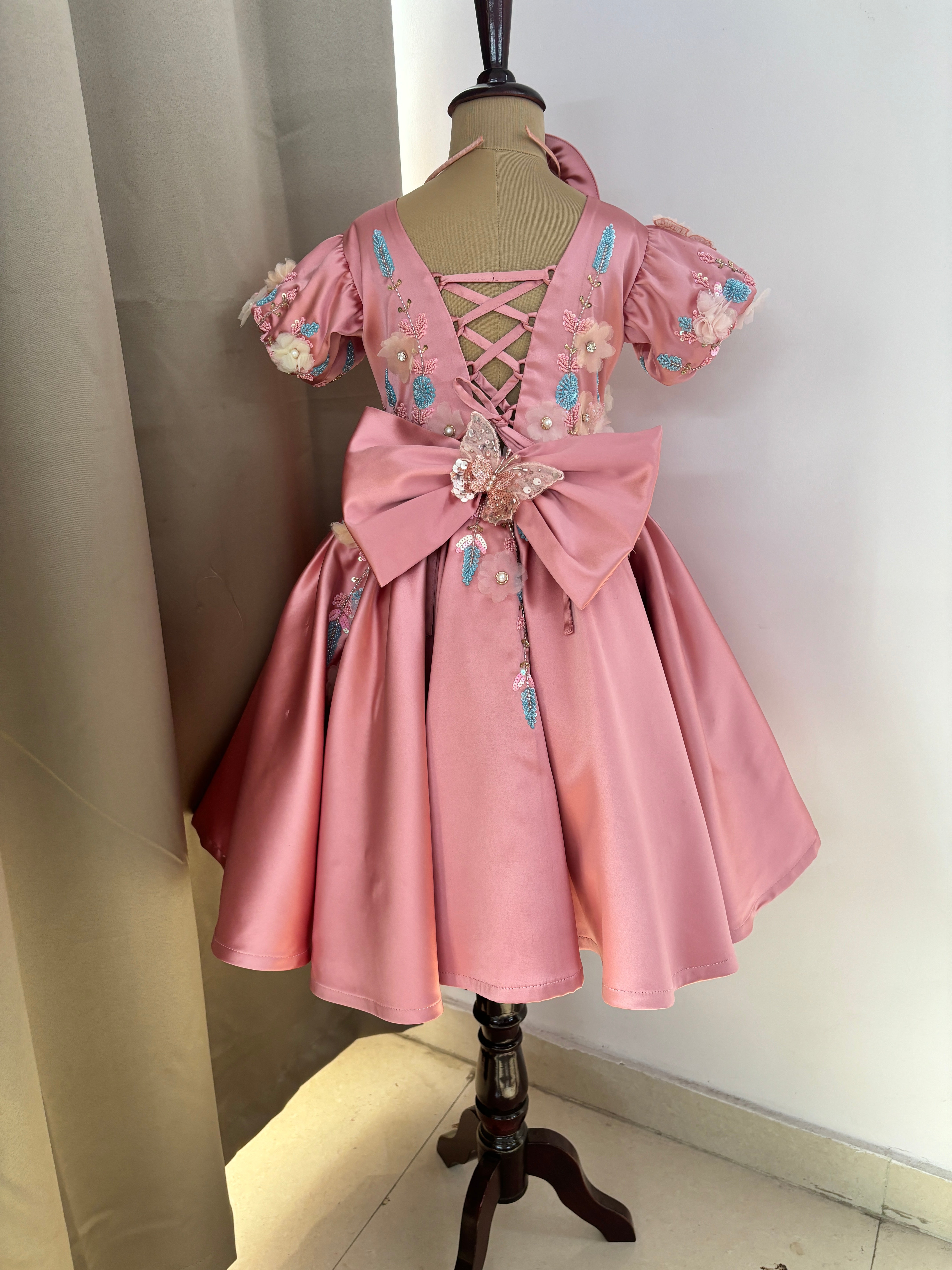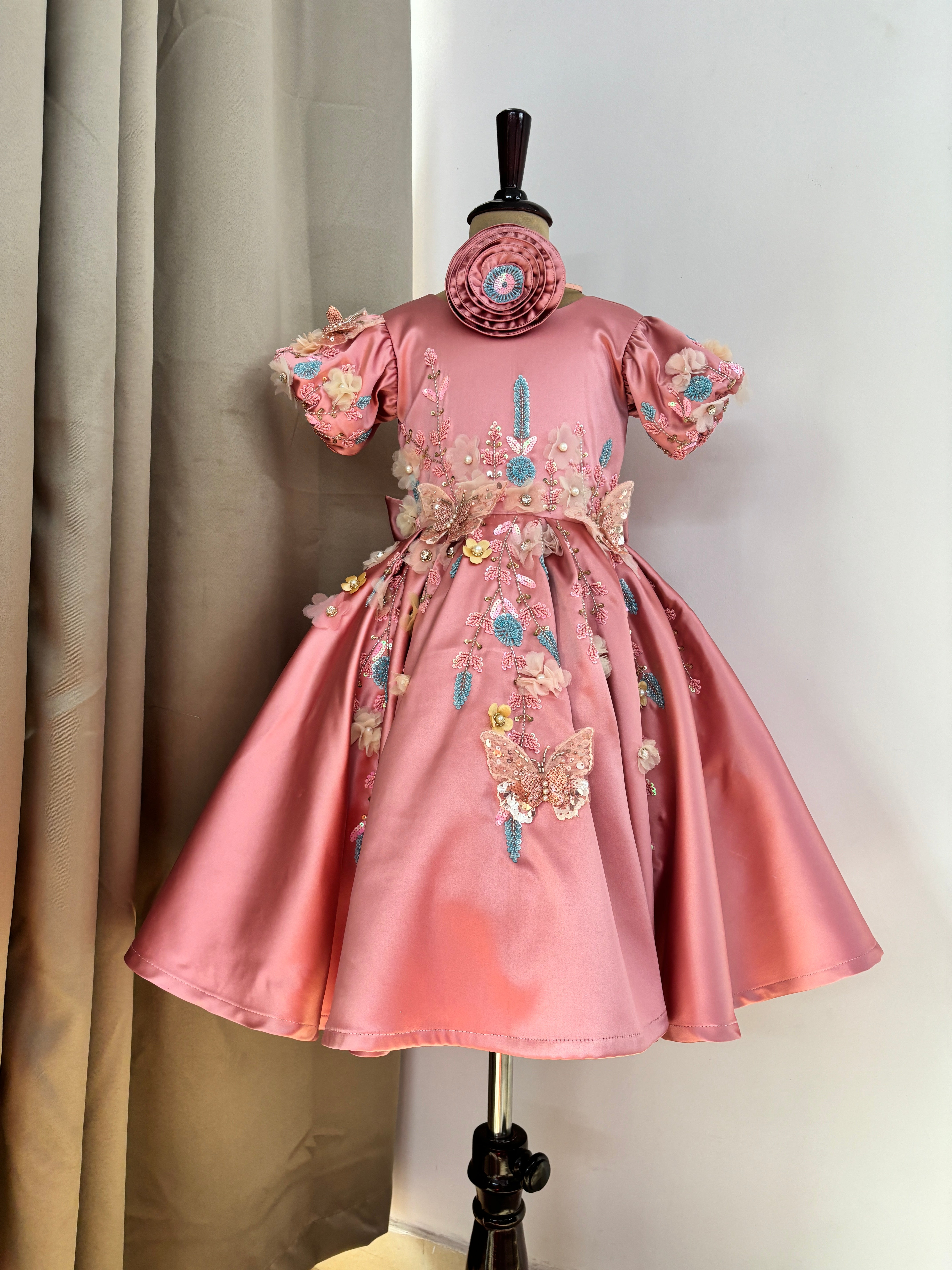 Girls Pink Satin Birthday Dress – Butterfly Embellishments & Floral Appliqué Gown
